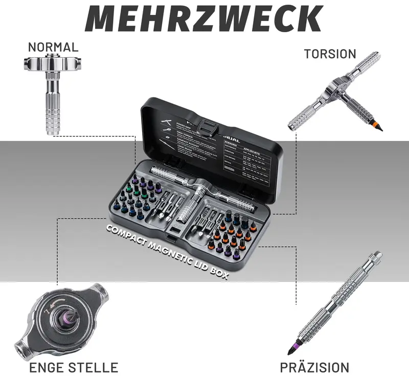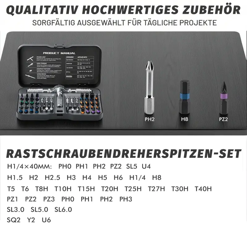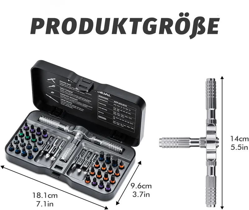 - Praktisch und funktional-Der Ratschensatz enthalt 6 Bits mit langem Schaft und 32 Bits mit kurzem Schaft. Es bietet eine große Auswahl an wichtigen Bits, wie Phillips-, Schlitz-, Sechskant- und Torx-Bits. Die magnetischen Komponenten sorgen für eine sichere Verbindung und sind langenverstellbar, sodass auch schwer zugangliche Stellen erreicht werden konnen.
