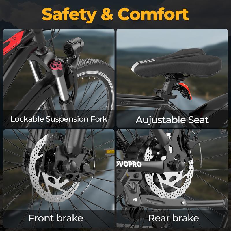 - ·Riding Comfortably and Handily: The 26″ puncture resistant tires are for greater durability. A high-strength front fork suspension, 7-speed gears, dual lights, LCD display, front and rear mechanical disc brakes can bring your riding more comforts, make your e-bike adapted to complex terrains and keep you safe