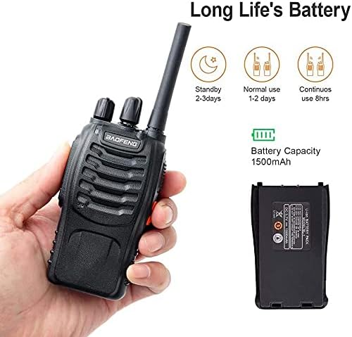 - Each two-way radio is equipped with a 1500mAh rechargeable lithium ion battery and a USB charging stand. It takes about 4-5 hours to fully charge, and the sustainable use time of a full charge is about 8-12 hours, depending on the amount of use.When the battery is too low, the walkie-talkie will automatically broadcast low battery.