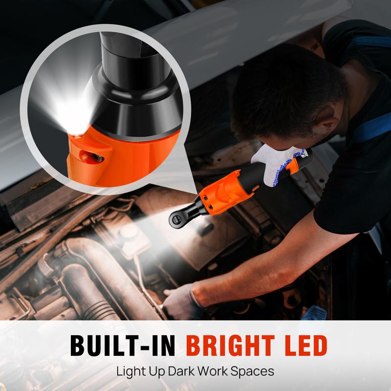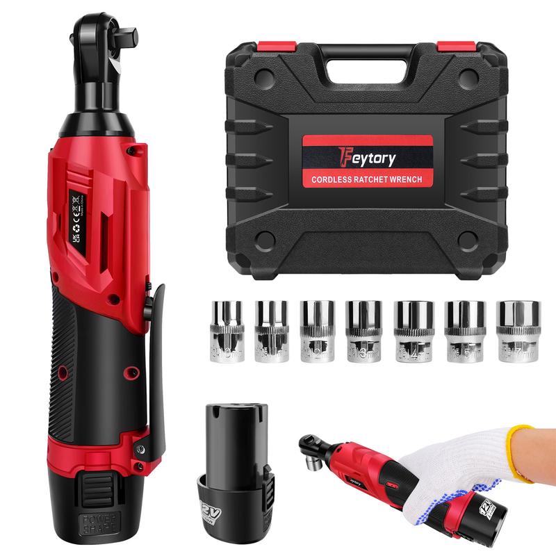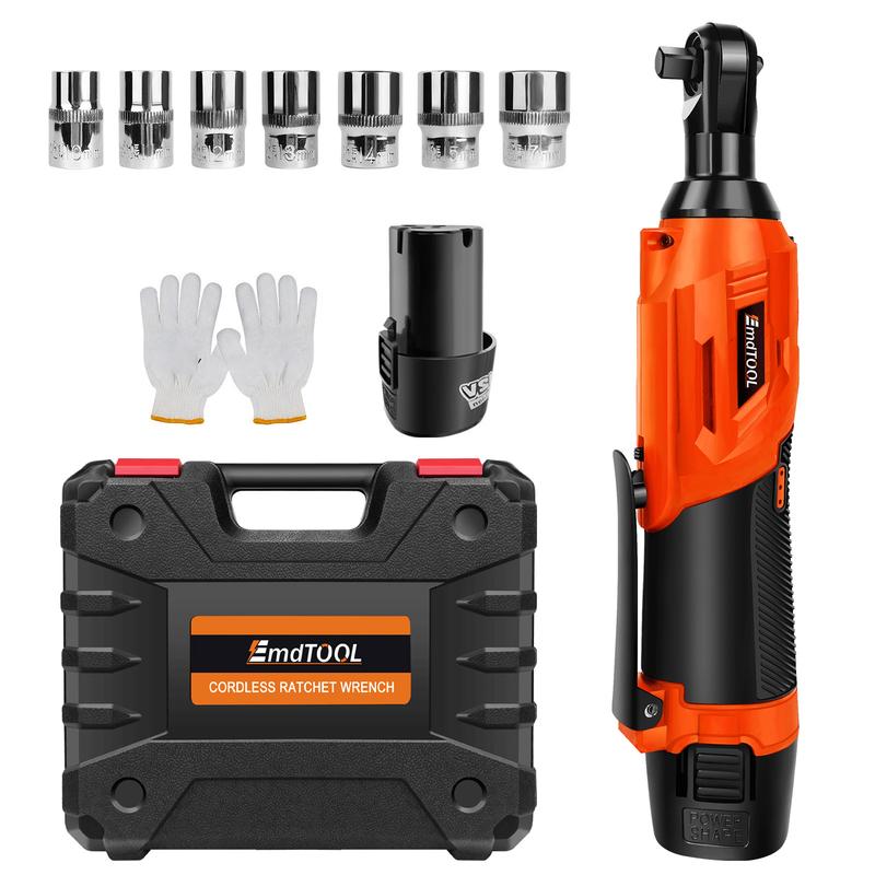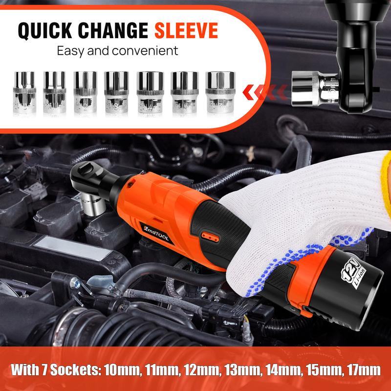 🌟Specifications:·1. Color: Orange / Red·2. Maximum torque: 30 ft-lbs / 40N.m·3. Speed: 0-230RPM·4. Chuck size: Square Driver 3/8″ (10mm)·5. Angle: Right angle·6. Battery: 2Pcs 1500mAh lithium batteries·7. Battery voltage: 12V·8. 7Pcs Socket Set: 10mm, 11mm, 12mm, 13mm, 14mm, 15mm, 17mm·9. Item Weight: 1.5kg·10. Forward/Reverse Switch: Forward To Tighten The Bolts, Reverse To Unscrew The Bolts·11. LED Light: Yes·12. Muti-purpose Use: Stage Construction, Car Repair, DIY Installation, Auto Mechanics, Bicycle Maintenance, Home Repair Wok.