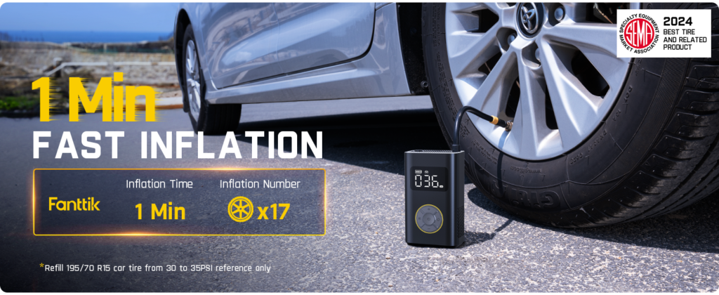 - 1 Min Jet-inflate: the Fanttik X9 Pro needs only 1 min to refill a compact cars tire ( from 30 to 35 PSI); It can reach a versatile maximum inflation pressure of 150 PSI, optimized for compact cars, motorcycles, SUVs, bicycles, balls, and other inflatables