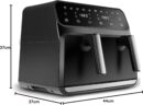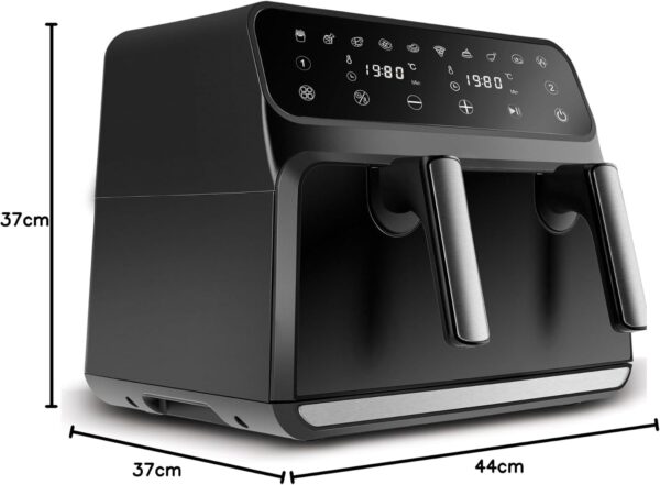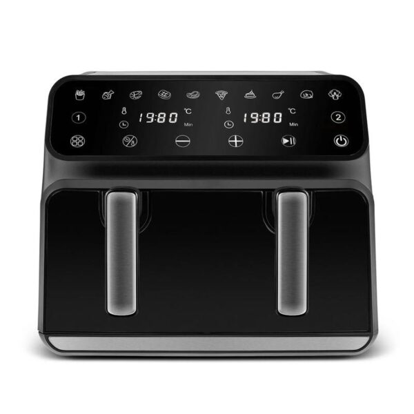 - Doppelkammer mit Trennwand: Vereinfachen Sie die Zubereitung Ihrer Mahlzeiten mit zwei 4,5-Liter-Kammern, die separat zum Kochen verschiedener Gerichte oder zusammen als geräumige 9-Liter-Kammer verwendet werden können. Egal, ob Sie Hühnchen oder Pizza zubereiten, dieser vielseitige Air fryer passt sich Ihren Bedürfnissen an.