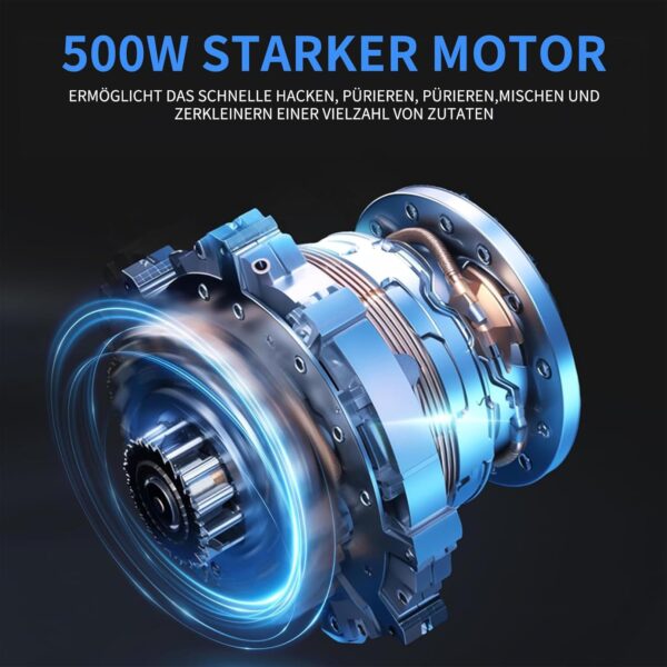 - 500- W- HOCHLEISTUNGSMOTOR& EDELSTAHLKLINGEN: Ausgestattet mit einem robusten 500- W- Motor und langlebigen Edelstahlklingen, erledigt diese Küchenmaschine Zerkleinerungsaufgaben im Handumdrehen und schneidet die Zutaten mühelos in Sekundenschnelle.