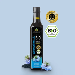 Kräuterland Bio Schwarzkümmelöl 500ml, ungefiltert, ohne Zusatzstoffe, hoher Thymochinon, Omega Fettsäuren, kaltgepresst, vegan, dunkle Gasflasche