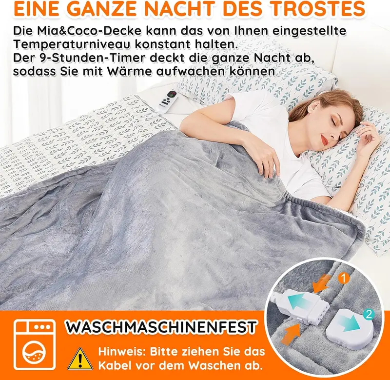 - Die Warme hat Sie an kalten Tagen vollstandig bedeckt:Die elektrisch beheizte Decke von Mia & Coco verfügt über 10 Temperatureinstellungen und 9 Auto-Off- Timer-Stufen, die mit Flanell & Sherpa hergestellt wurden, damit Sie einen angenehmen Winter genießen konnen. Weich und komfortabel:Hergestellt aus Flanell und Sherpa, um eine hervorragende Warmespeicherleistung und ein hautfreundliches Erlebnis zu bieten. Kein kaltes Gefühl beim Beruhren, selbst wenn die Heizung noch nicht gestartet wurde. 10 Temperaturstufen,9-Stunden-Auto-Off-Timer für Sicherheit und Energieeinsparung :Uber die Steuerung erhalten Sie 10 Optionen für die Zieltemperatur von 1, 2 bis 9 und H (25° C bis 53 C).Mit dem Timer konnen Sie die Stunden für das Ausschalten einstellen. Sicher mit ETL-Zertifikat zu verwenden:Diese Heizkissen bestehen aus hochwertigem Material und sind von hoher Qualitat. Sie konnen sie mit Sicherheit verwenden, wenn Sie sie gemaß Benutzerhandbuch verwenden. Maschinenwaschbar: Sie konnen das Kabel abnehmen und diese Decke von Hand oder maschinell waschen, indem Sie der Anleitung im Benutzerhandbuch folgen.