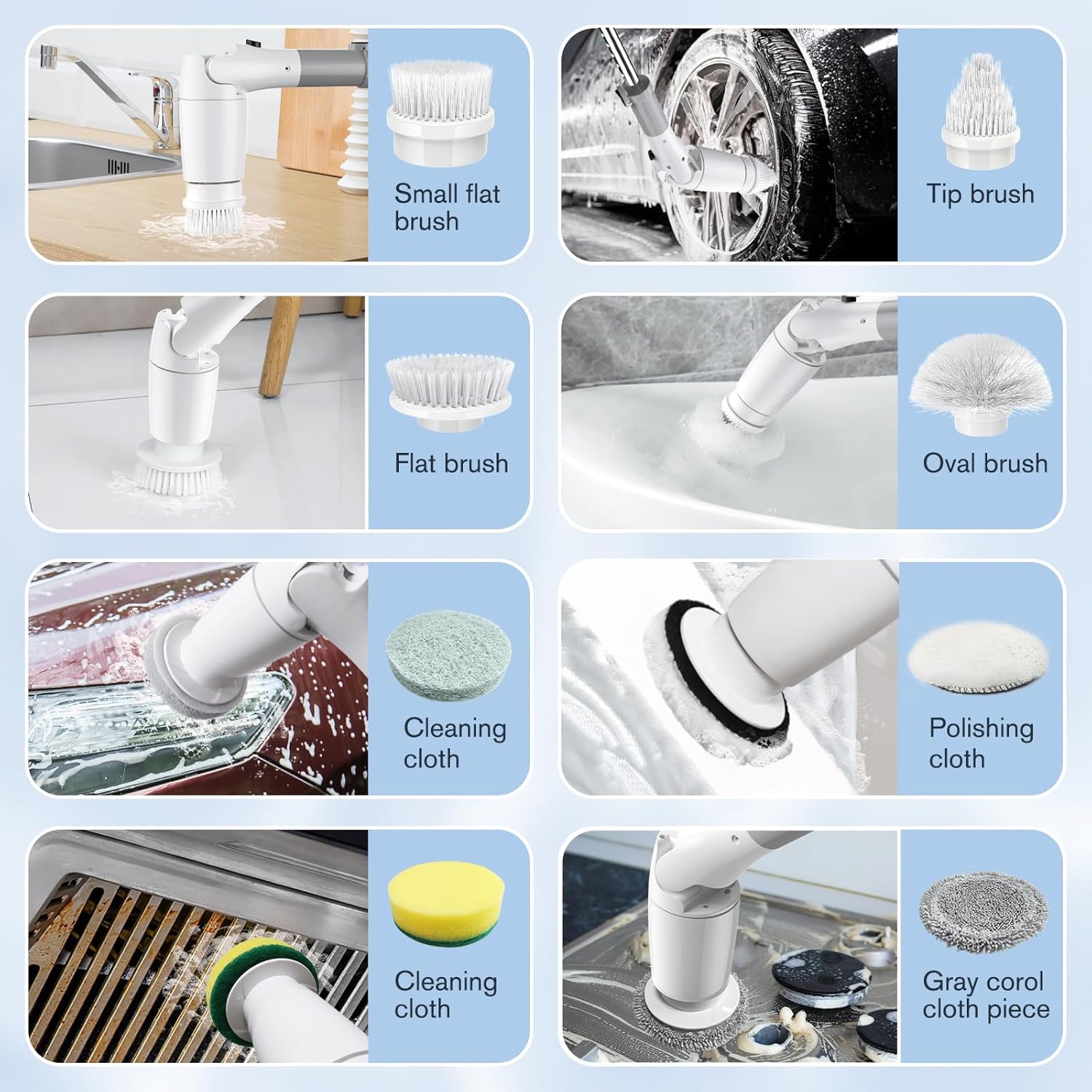 - 【8 Vielseitige Bürstenköpfe】Die elektrische reinigungsbürste bad enthält 8 austauschbare Reinigungsbürsten für verschiedene Szenarien. Flache Bürste für Oberflächen wie Fliesenboden, Wand und Pool; Eckbürste ist großartig für die Reinigung von Fugen, Wasserhähnen, Kanten; Stoffbürste für Holzboden und Möbelreinigung; der Schwamm ist für das Fenster. Außerdem können Sie mit diesen Köpfen sogar Ihr Auto polieren und wachsen.
