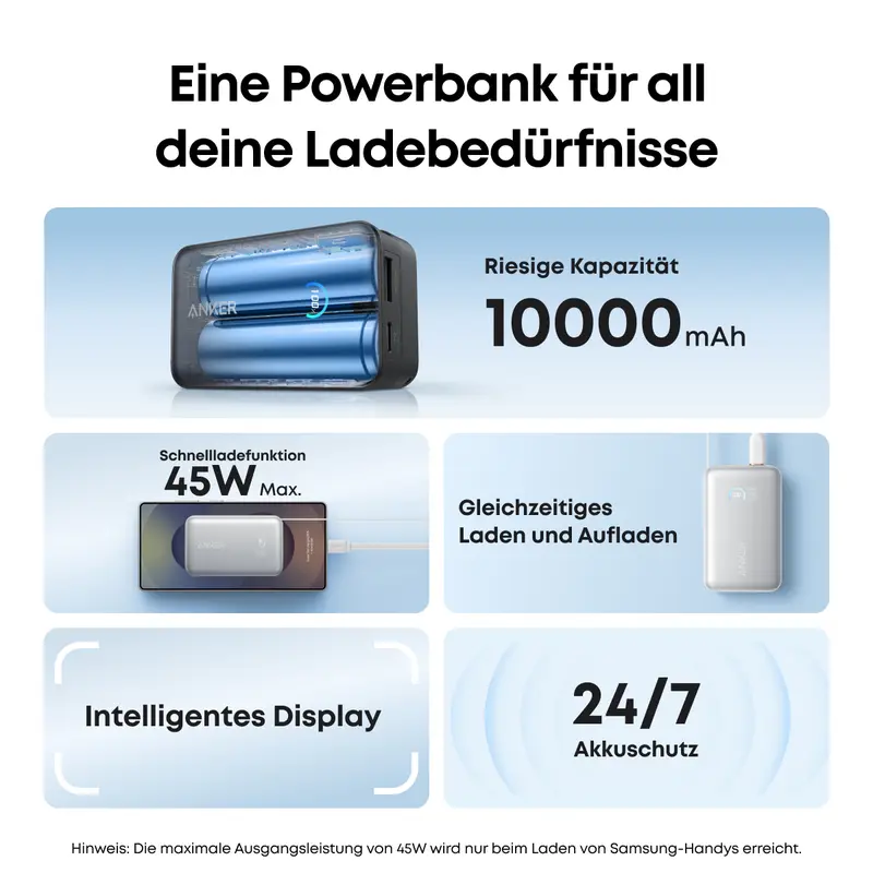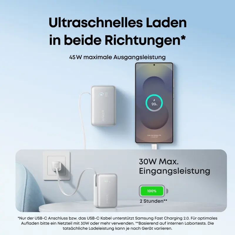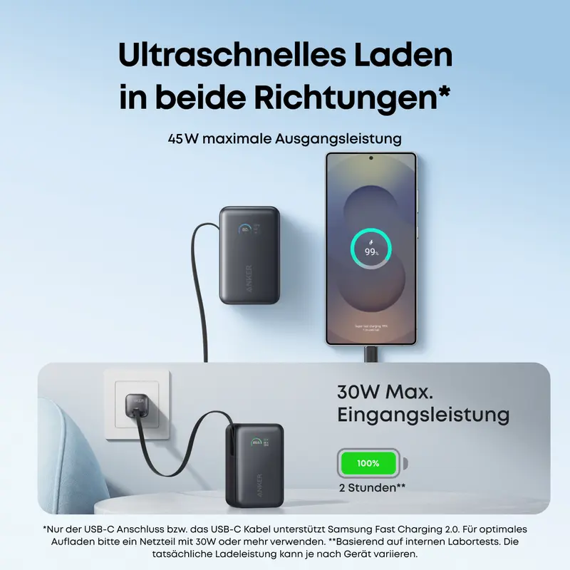- Die Anker Nano Powerbank kombiniert kompaktes Design mit 22,5W Schnellladung – die 5.000 mAh Kapazität versorgt Smartphone und Tablet schnell und zuverlässig unterwegs.