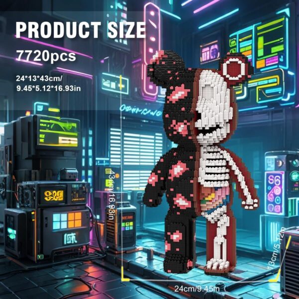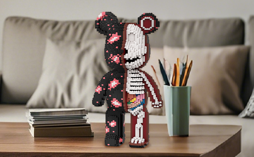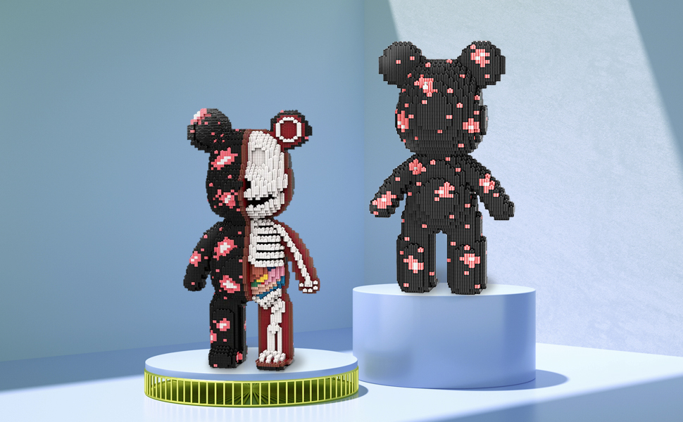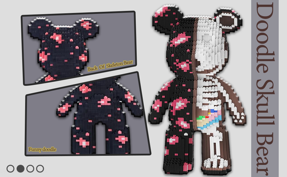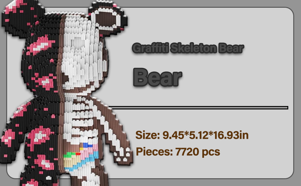 - Bear Building Blocks: The Graffiti Skull Bear Building Blocks are a creative art assembly model that combines the image of a black bear with gorgeous fireworks elements and skeleton design. Half of the model shows the vivid image of the black bear and the colorful fireworks pattern, while the other half reveals the internal bone structure of the black bear, adding a sense of fantasy and technology to the model.
