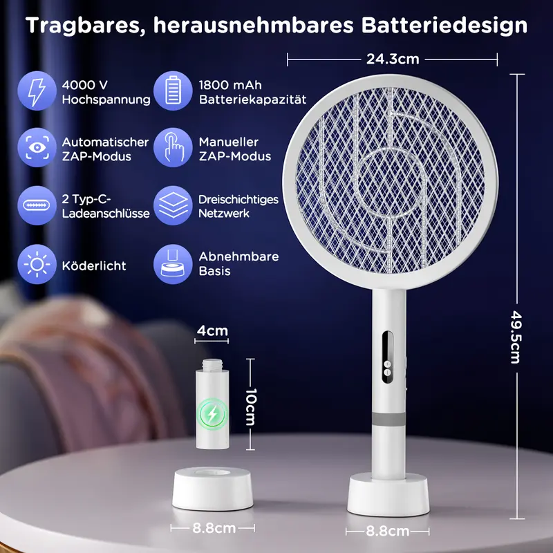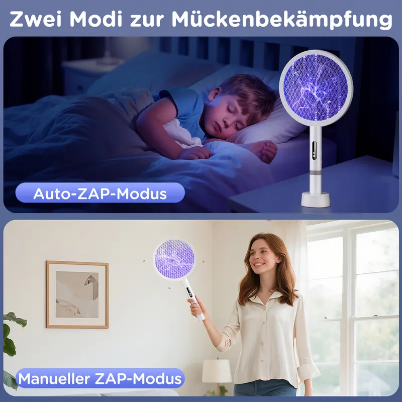 - 【2-in-1 Elektrische Fliegenklatsche mit Basisbetrieb】 Im manuellen Modus konnen Sie per Knopfdruck Mücken direkt abschlagen. Im Automatikmodus arbeitet das Gerat in der Ladestation selbststandig- mit UV-Licht zur Insektenanziehung und 40oov Hochspannung zur effektiven Bekampfung.