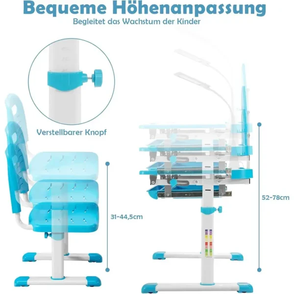 - Verstellbare Hohe: Die Hohen der Stuhl und Schreibtisch sind auch durch die Einstellknopfe leicht einzustellen, um das Wachstum Ihrer Kinder zu begleiten. Der Kinderschreibtisch kann in der Hohe von 52 bis 77 cm und der Stuhl von 31 bis 44 cm verstellt werden.