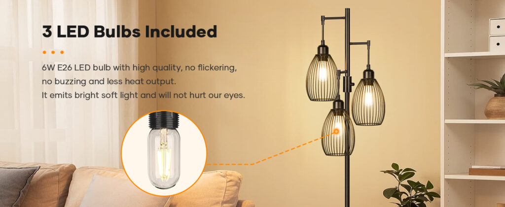 • 3 x 800 lumens LED Bulbs Included: Our floor lamps are designed with 3 E26 lamp holders. Compatible with a variety of normal E26 LED, CFL, incandescent and halogen bulbs etc(Dimmable Bulb Only). This set comes with an E26 base bulb, 25,000 hour bulb life, 6W(60W equivalent), 800 lumens, 2700K (warmwhite), No flicker or buzzing.