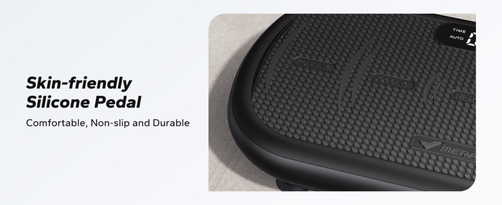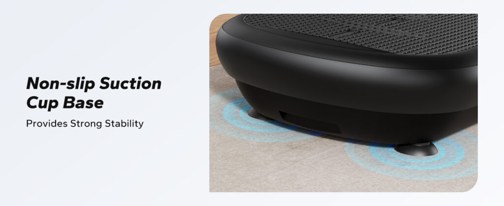 • Grotere plaat en gewichtscapaciteit: deze trilplaat kan tot 200 kg dragen en is daardoor ook geschikt voor personen met een hoger lichaamsgewicht, zonder dat je je zorgen hoeft te maken over beschadiging van het apparaat. De productafmetingen bedragen 72 x 38 x 16 cm en bieden een groter oppervlak. De onderkant is uitgerust met een antislip onderlaag die de stabiliteit verhoogt en het risico op uitglijden tijdens het gebruik vermindert.