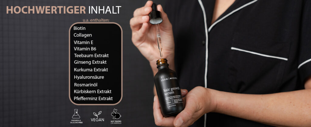 • Effektive Formel gegen Haarausfall: Unser Hair Growth Serum enthält 5% Biotin, kombiniert mit Rosmarin- und Ginseng-Extrakt. Diese kraftvolle Mischung bekämpft hormonell und altersbedingten Haarausfall und fördert gleichzeitig Dein Haarwachstum.
