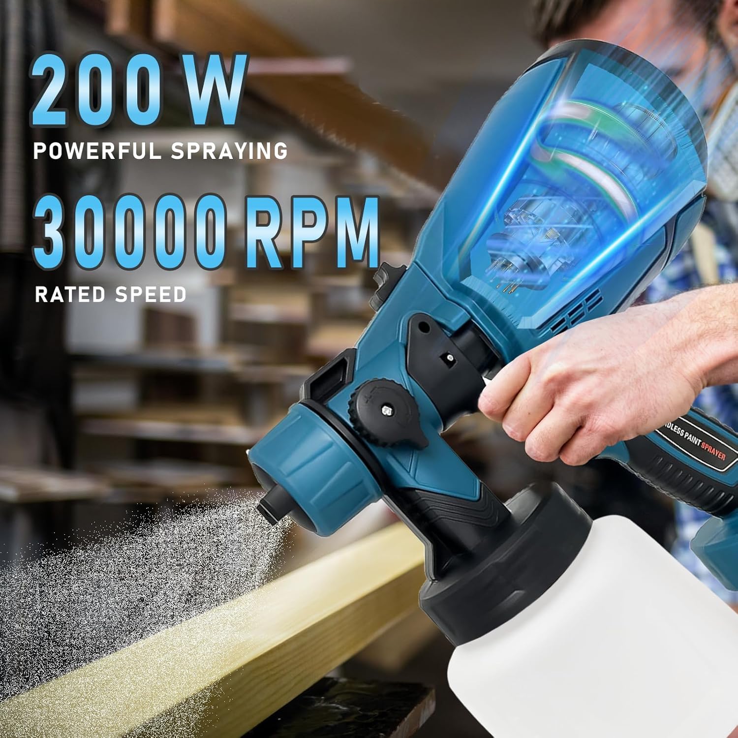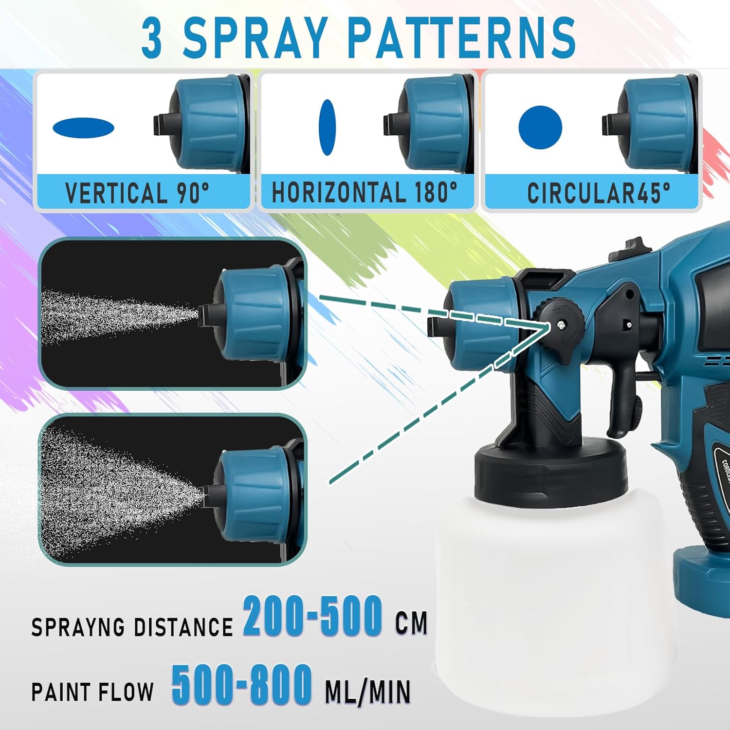 - 🌈【Efficient Spraying】The battery paint spray gun has a built-in 200W pure copper motor, which has good atomisation effect and ensures even spraying. Paint flow rate of 500-800ml/min, spraying distance of 200-300cm, suitable for fences, walls, ceilings, doors, windows, garden furniture and other wooden or metal surfaces.