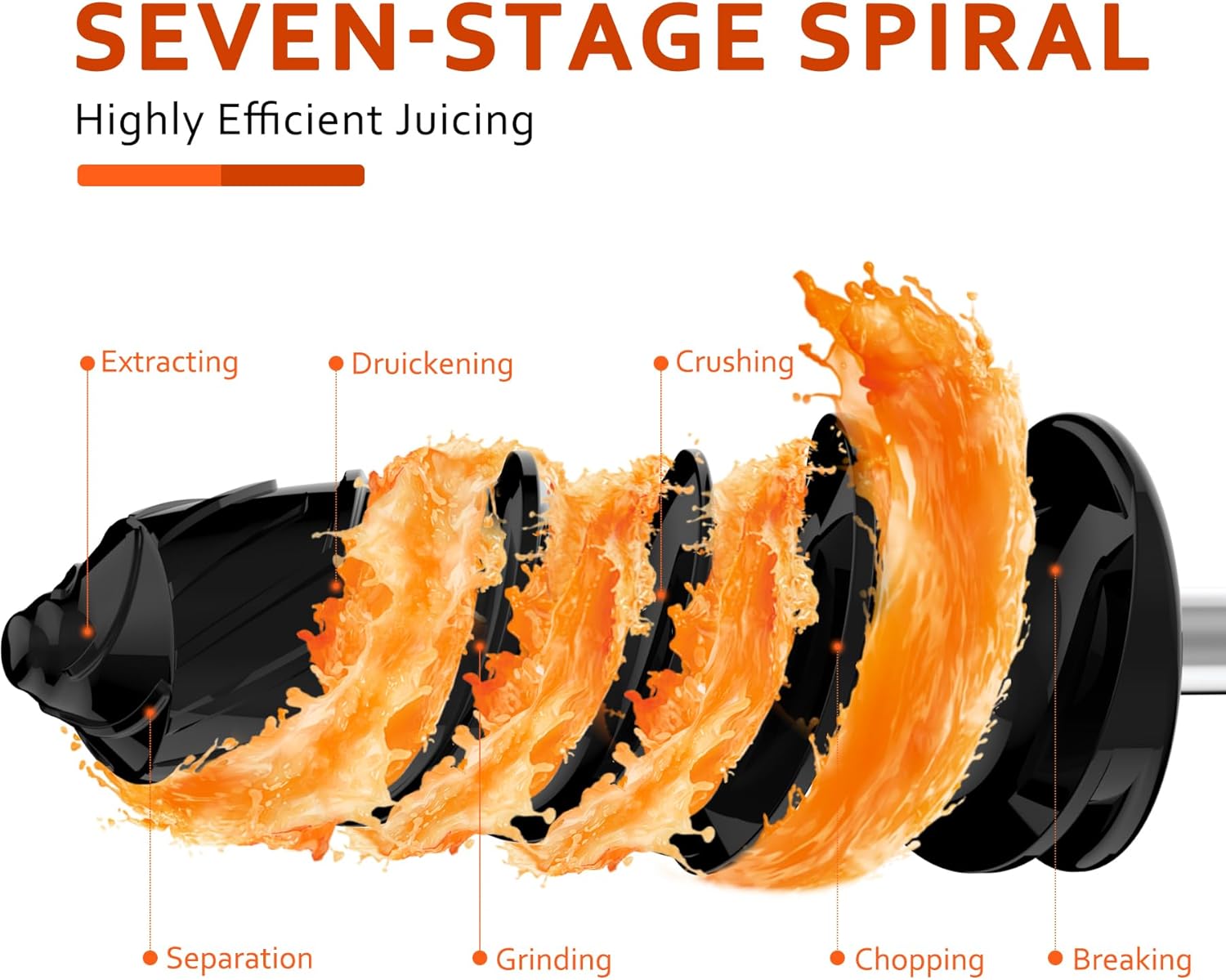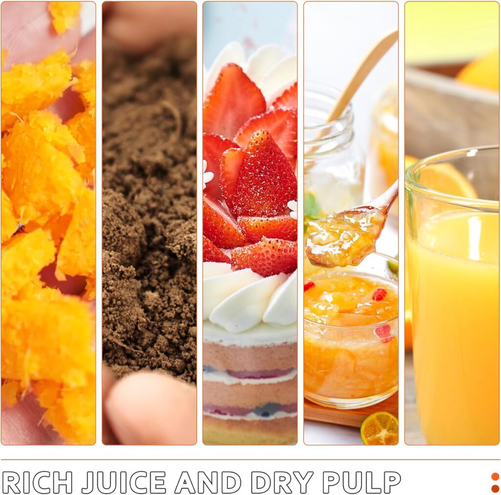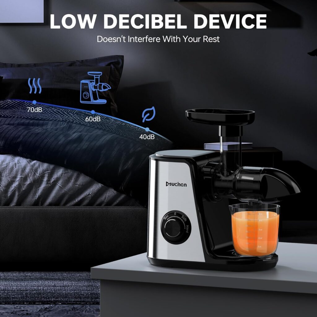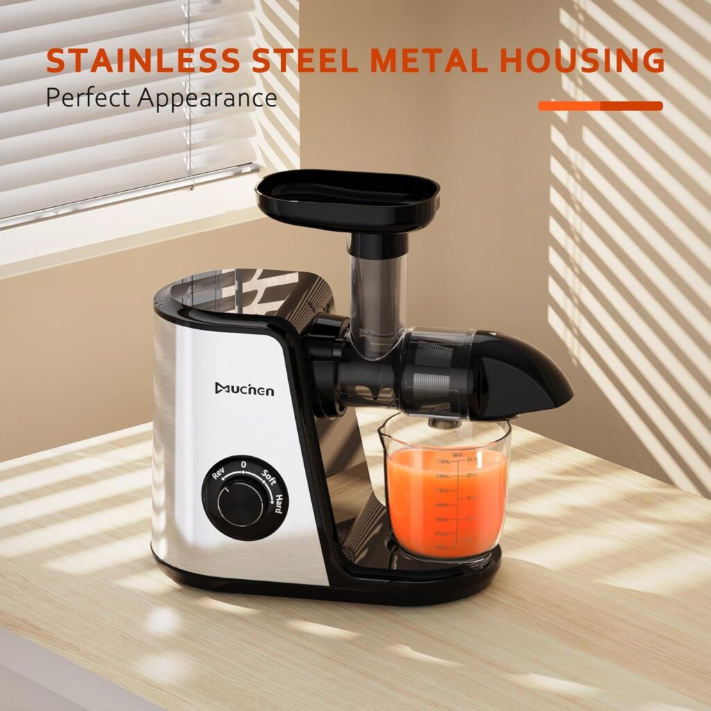 - Edelstahlgehäuse: Der Entsafter ist robust, langlebig und leicht zu reinigen, behält sein elegantes Aussehen ohne Fingerabdrücke.