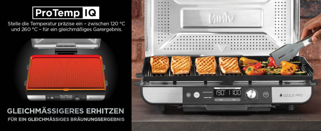 - BETTER TEMPERATURE CONTROL WITH PROTEMP IQ (COMPARED TO NINJA SIZZLE GR101): Set the temperature for precise cooking for frying and searing from 120 to 260 °C. With timer function.