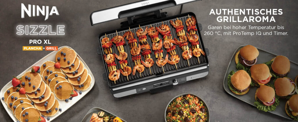 - Includes: Ninja XL Sizzle Pro indoor electric grill (EU plug), removable lid, non-stick grill plate and plancha, grease drip tray, quick start guide with recipes.