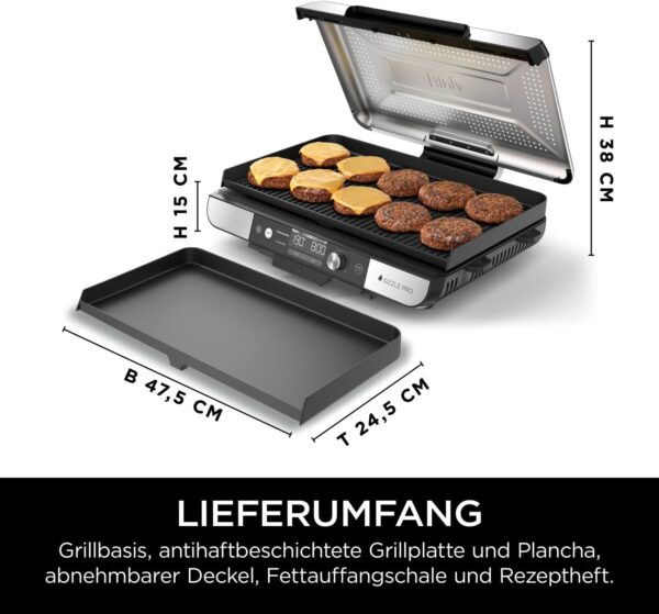 - Includes: Ninja XL Sizzle Pro indoor electric grill (EU plug), removable lid, non-stick grill plate and plancha, grease drip tray, quick start guide with recipes.