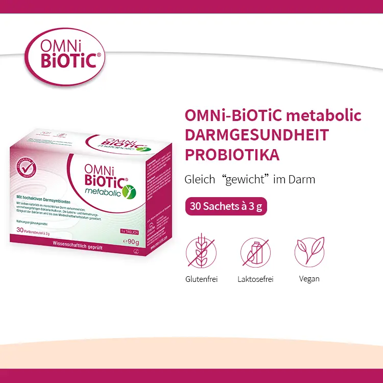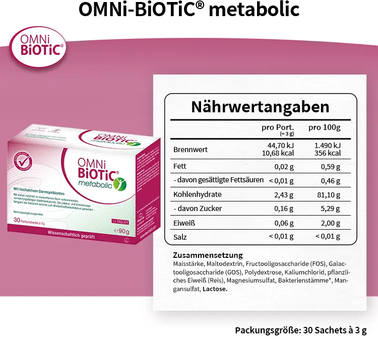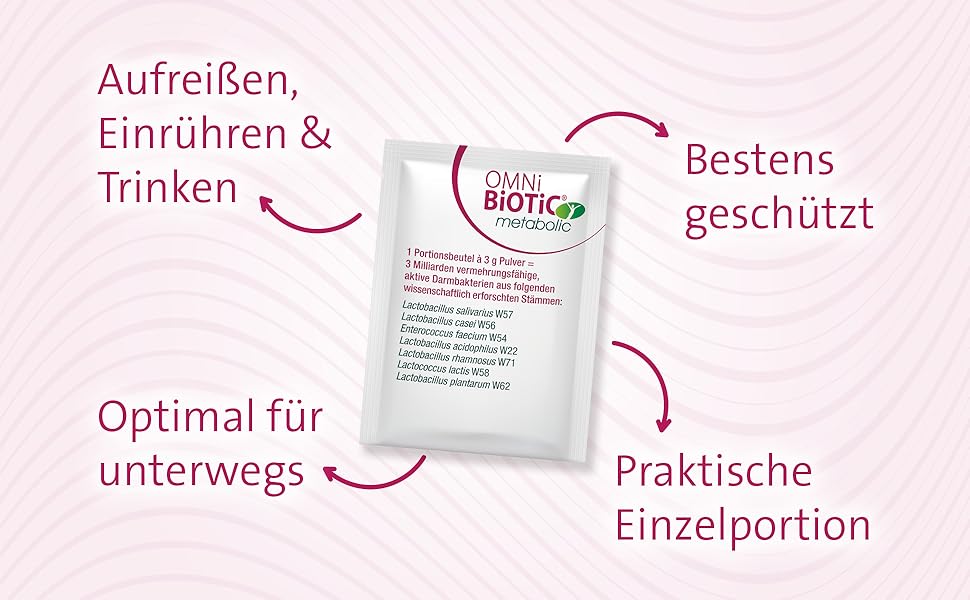 • Anwendung:1 x taglich 1 Beutel OMNi BiOTiC metabolic in 1/8 I Wasser einrühren, mindestens 1 Minute Aktivierungszeit abwarten, nochmals umrühren und dann trinken. Empfehlenswert ist die Einnahme morgens vor dem Frühstück oder abends kurz vor dem Schlafengehen.