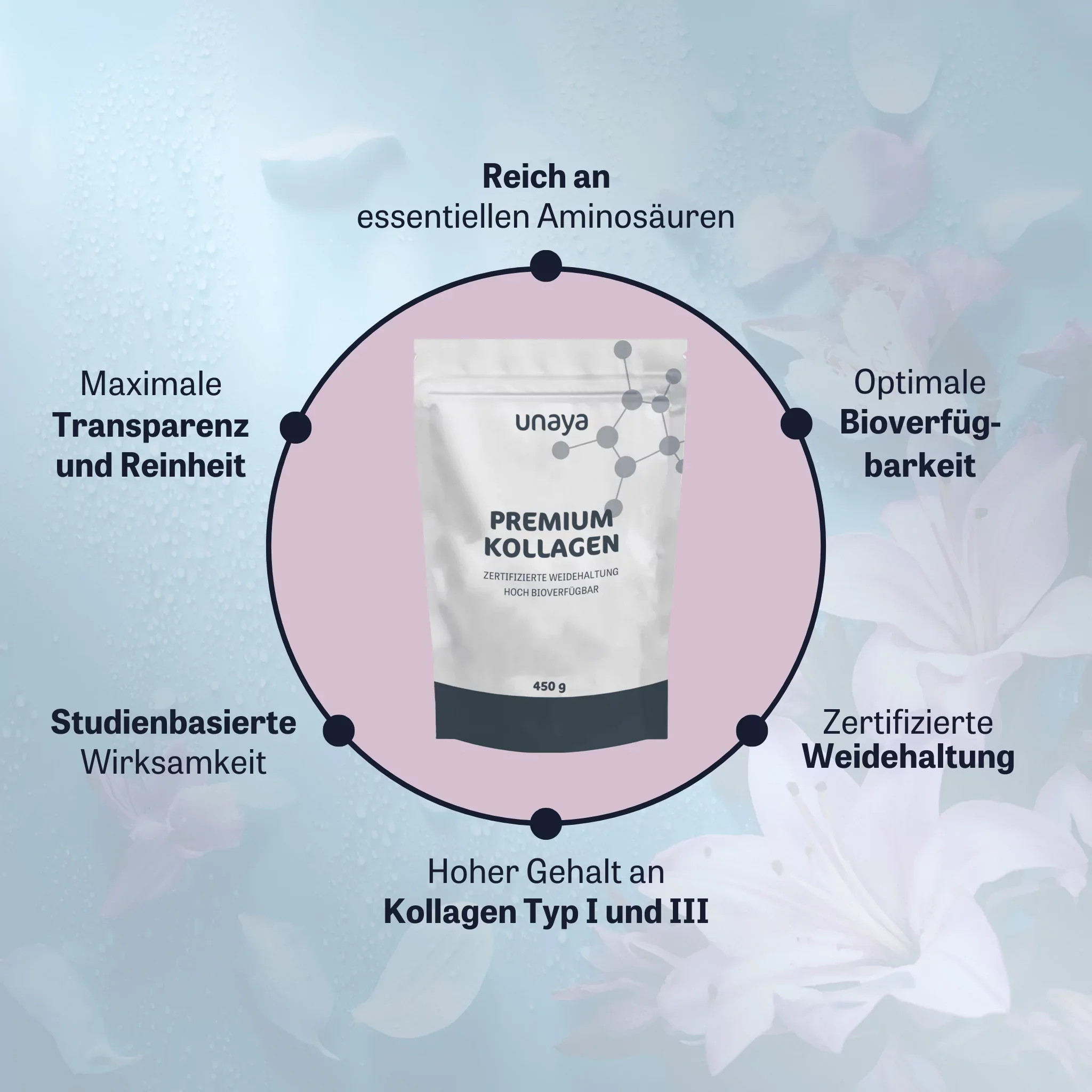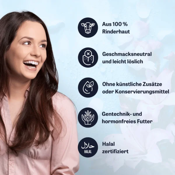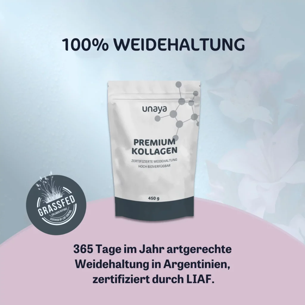 - Unser Premium Kollagen Pulver stammt ausschlieBlich aus der Haut von argentinischen Rindern, die artgerecht auf saftigen Weiden gehalten werden. Mit zertifizierter Herkunft und nachhaltigen Produktionsstandards bieten wir Dir maximale Transparenz und Qualitat. Anders als bei vielen Anbietern weißt Du bei uns genau, was Du bekommst: reines Kollagenhydrolysat aus einer nachvollziehbaren Quelle. Von grasgefütterten Rindern: 365 Tage im Jahr natürliche Weidehaltung unter der Sonne Argentiniens, zertifiziert durch LIAF. Hochste Sicherheitsstandards: Frei von Wachstumshormonen und ohne chemischen Herstellungsprozess. Ohne Zusatzstoffe: Frei von Zucker, Fett, Gluten, Cholesterin und Kohlenhydraten. Vielseitig einsetzbar: Geschmacks- und geruchsneutral, lost sich mühelos in heiBen oder kalten Flüssigkeiten auf- perfekt für Deinen Alltag AuBerdem: Der Rohstoff unseres Premium Kollagen Pulvers ist halal-zertifiziert.