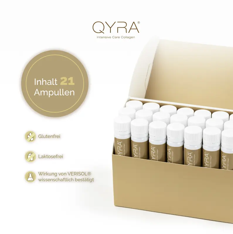 Anwendung: Taglich 1 Flaschchen QYRA Collagen Drink einnehmen. Vor Gebrauch gut schütteln. Für sichtbare Ergebnisse empfehlen wir eine Einnahme über mindestens 3 Monate. Alternativ eignet sich eine 3- monatige Kur, 2-3 Mal pro Jahr. Hinweis: Nahrungserganzungsmittel sind kein Ersatz für eine ausgewogene Ernahrung. VERISOL Kollagen wird aus Rindern hergestellt. *Die Wirkung von VERISOL ist in Studien belegt