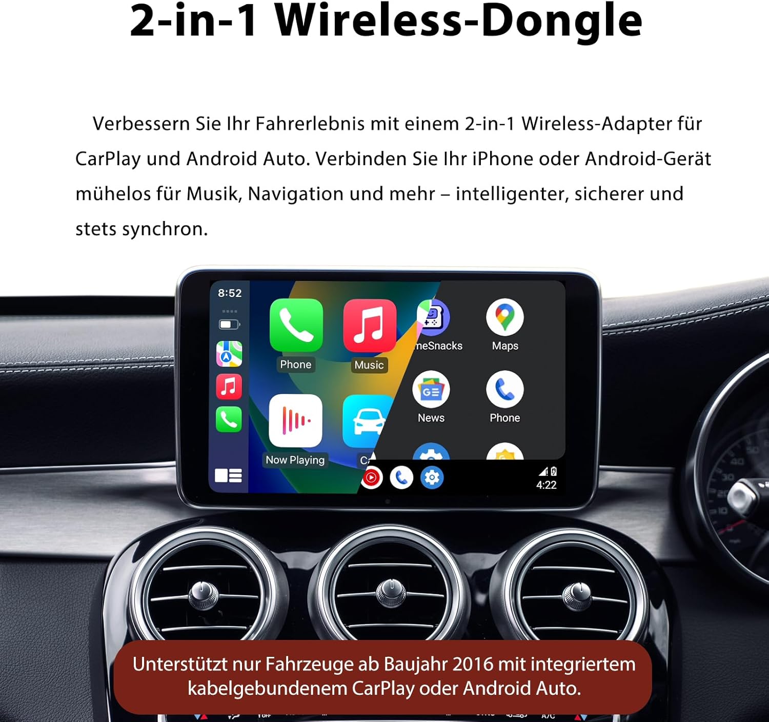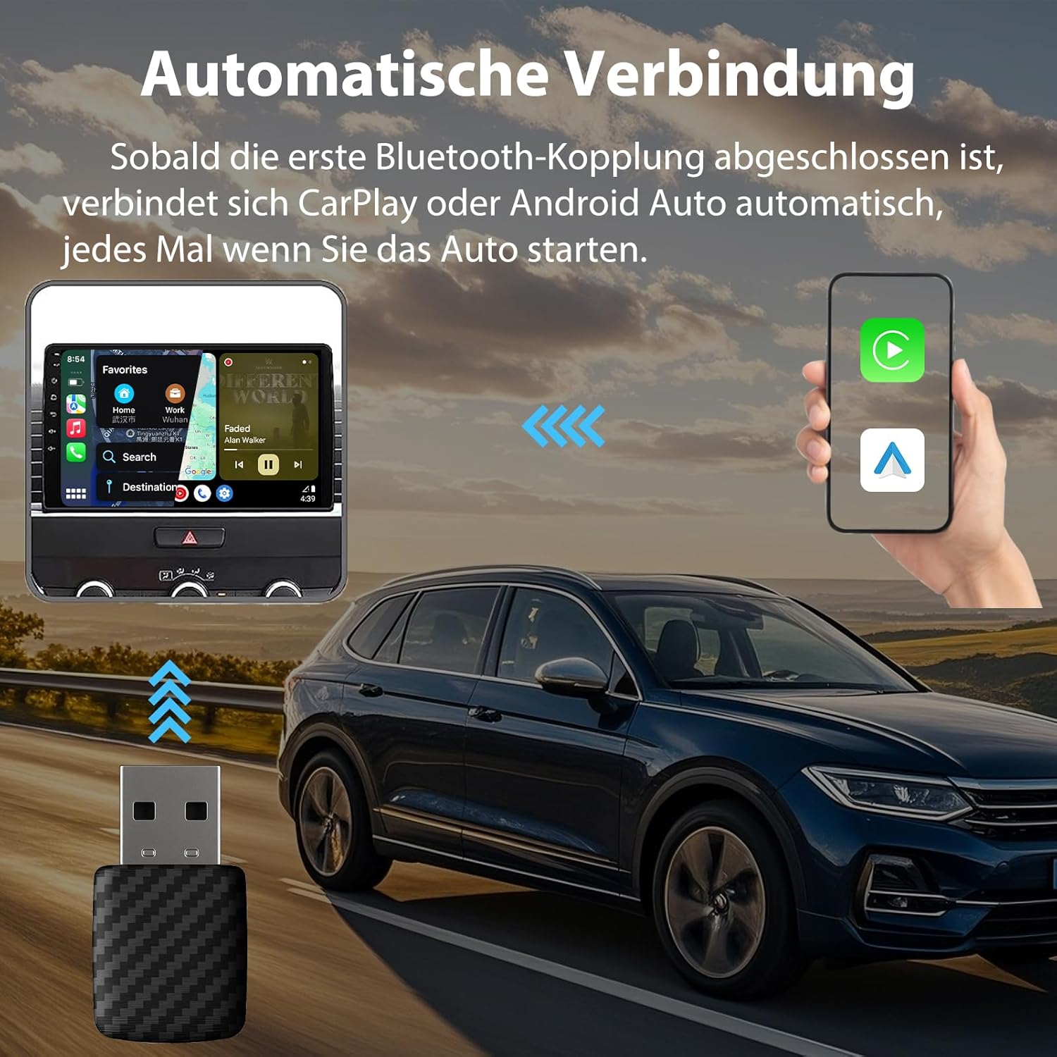 Zu den Highlights des Sunweyer-S28 gehören die umfassende Kompatibilität mit Autos, die bereits über ein kabelgebundenes CarPlay verfügen. Egal, ob Sie ein iPhone mit CarPlay oder ein Android-Smartphone mit Android Auto nutzen, dieser Adapter verbindet sich stabil und zuverlässig per Wireless-Technologie, sodass Sie Ihre Lieblings-Apps, Navigation, Musik und Anrufe direkt über das Fahrzeugdisplay steuern können – ganz ohne Kabelverbindung.