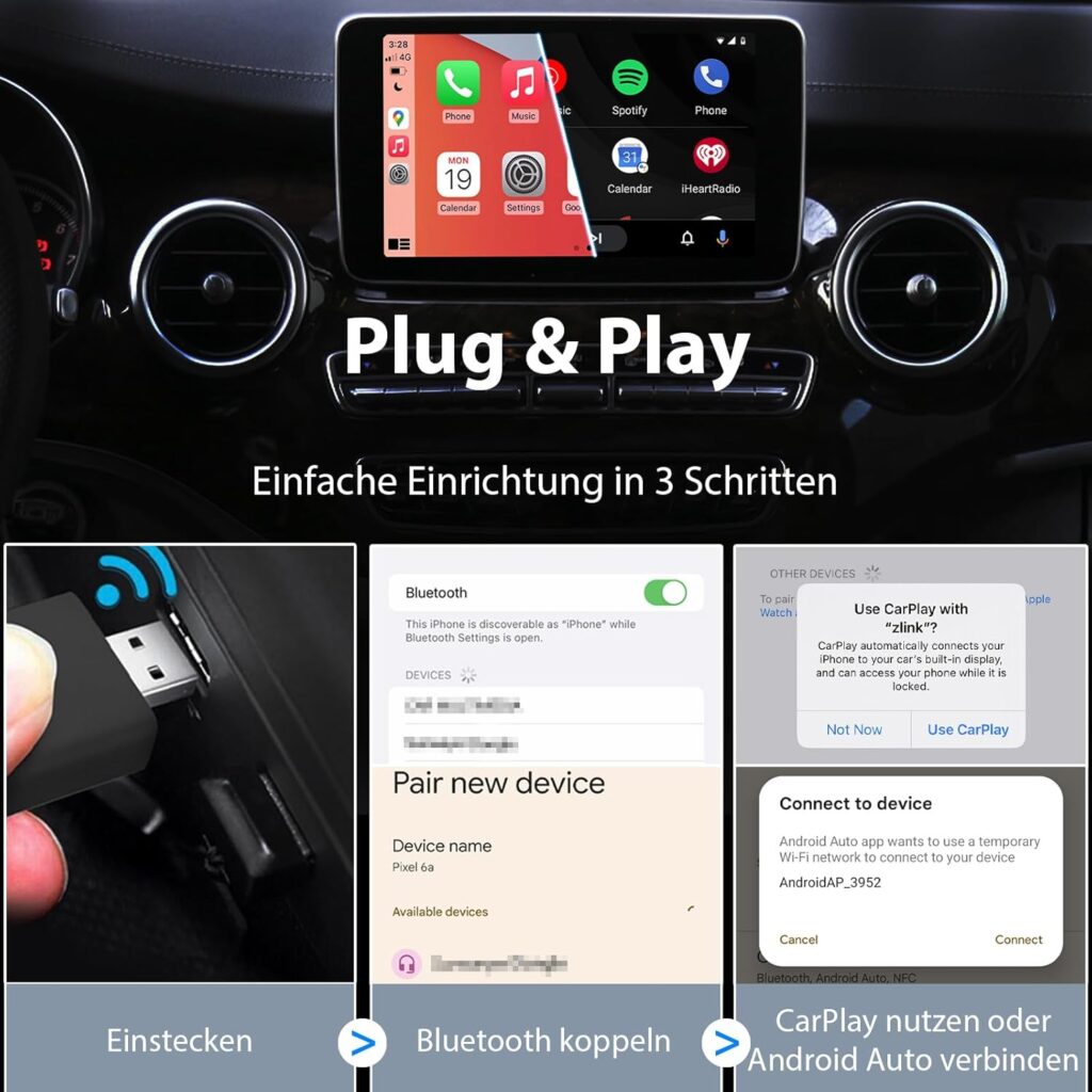 Zu den Highlights des Sunweyer-S28 gehören die umfassende Kompatibilität mit Autos, die bereits über ein kabelgebundenes CarPlay verfügen. Egal, ob Sie ein iPhone mit CarPlay oder ein Android-Smartphone mit Android Auto nutzen, dieser Adapter verbindet sich stabil und zuverlässig per Wireless-Technologie, sodass Sie Ihre Lieblings-Apps, Navigation, Musik und Anrufe direkt über das Fahrzeugdisplay steuern können – ganz ohne Kabelverbindung.