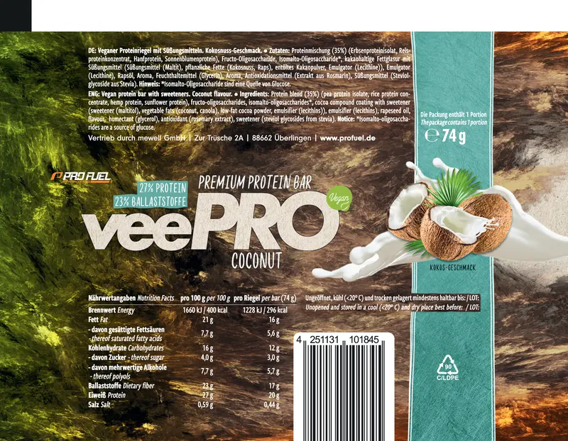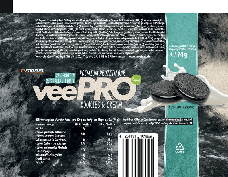 - 💪 DER PERFEKTE VEGANE EIWEISSRIEGEL: Eine cremig zarte Füllung umhüllt mit einer feinen Schokolade – das macht den veePRO Eiweißriegel zu dem, was er ist: Nämlich zu einem der leckersten und hochwertigsten veganen Proteinriegel.